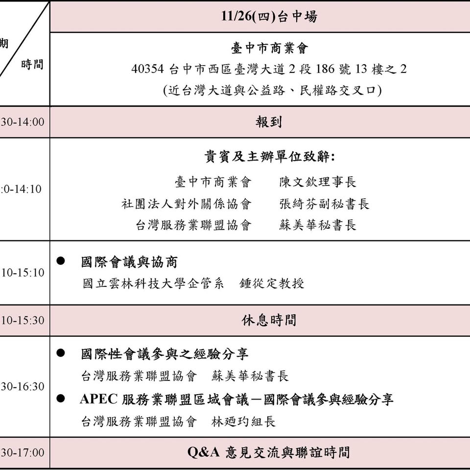 On November 26, from 2pm to 5pm, the Taichung City Business Association will be held at the Taichung City Chamber of Commerce ( 13th floor, No. 186, Sec. 2, Taiwan Avenue, West District, Taichung City). It will be co-organized by this Association, Taiwan Service Union and Taichung City Business Association. Prof. Yao Congding, Department of Business Management, National Yunlin University of Science and Technology, is invited to share his experience with the audience on "international conference and consultation". The Secretary General of Taiwan Union Sumihua and Team Leader Lin Bin presented their personal experiences with the topics of "Experience Sharing of International Conference Participation" and "APEC