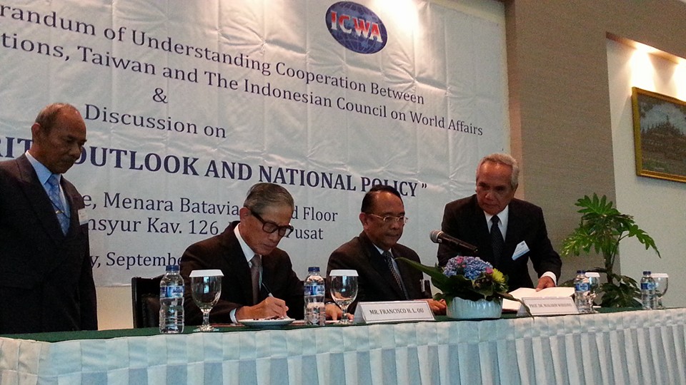 對外關係協會與印尼國際事務協會(ICWA)簽署合作備忘錄,歐會長鴻鍊及ICWA理事會主席Wibisono分別致詞並簽署備忘錄。