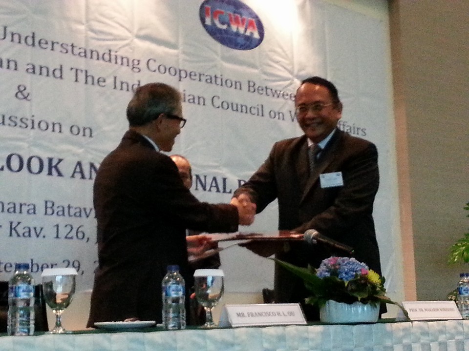 The Association for Foreign Relations signed a MOU with the Indonesian Association of International Affairs (ICWA), and the President of the Council of ICWA, Wibisono, spoke and signed the MOU respectively.