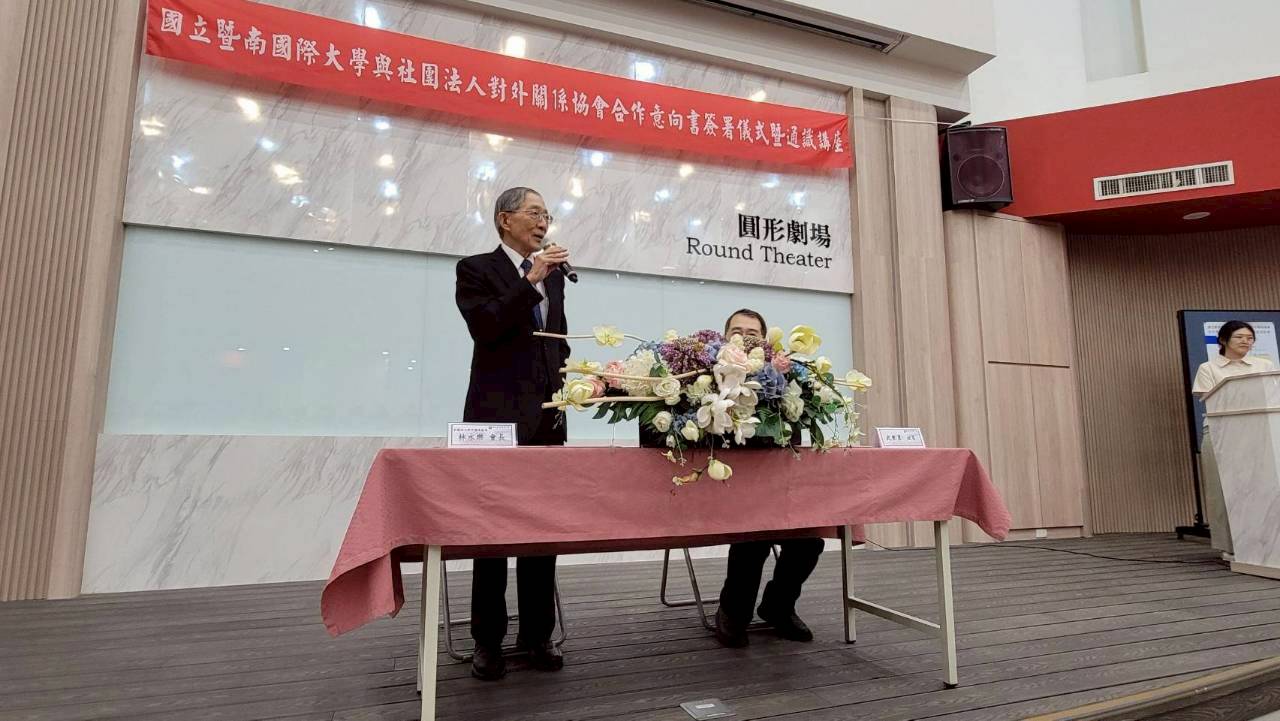 林永樂會長致詞時表示:外交實務是國家生存發展的命脈,協會內匯集了大量具備豐富經驗的退休外交官和資深教授。透過與暨大的合作,我們能將這些寶貴的實務經驗系統性地帶入校園,為年輕人開啟一扇通往國際社會的窗口。我們深信,培養具備國際常識和全球視野的年輕世代,是提升國家整體外交實力的基石。