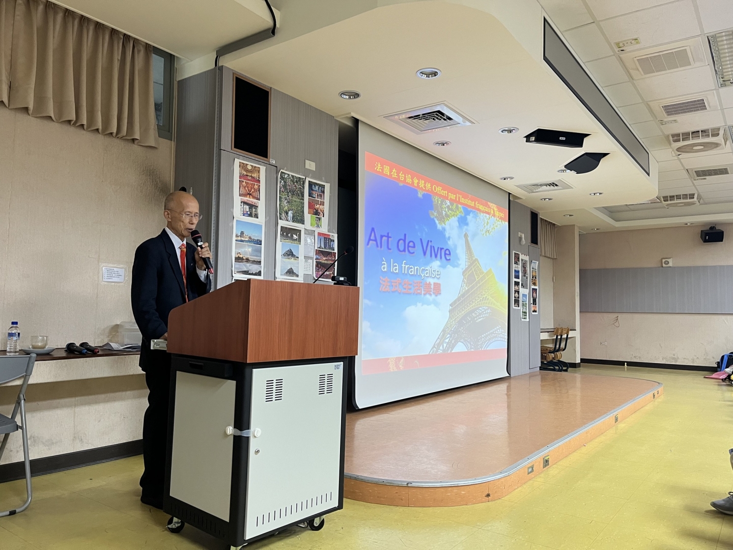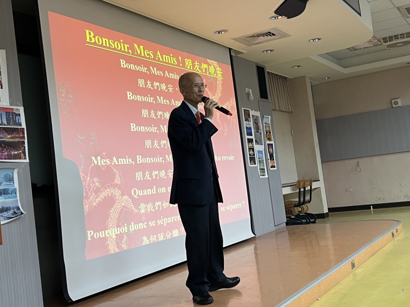 由本校率先邀請前駐法16年的特派大使呂慶龍博士為學生帶來精彩的演講,分享從在地文化出發,運用[耐煩]哲學及創意發想來突破外交困境、行銷台灣,也利用各式影音、照片,介紹法國文化及觀點,營造一場法國饗宴!演講高潮請見最後一張照片,有大使邀請現場師生高歌一曲法文版「朋友們晚安」,大使帶領師生練習,最終一起唱出悅耳的歌曲。