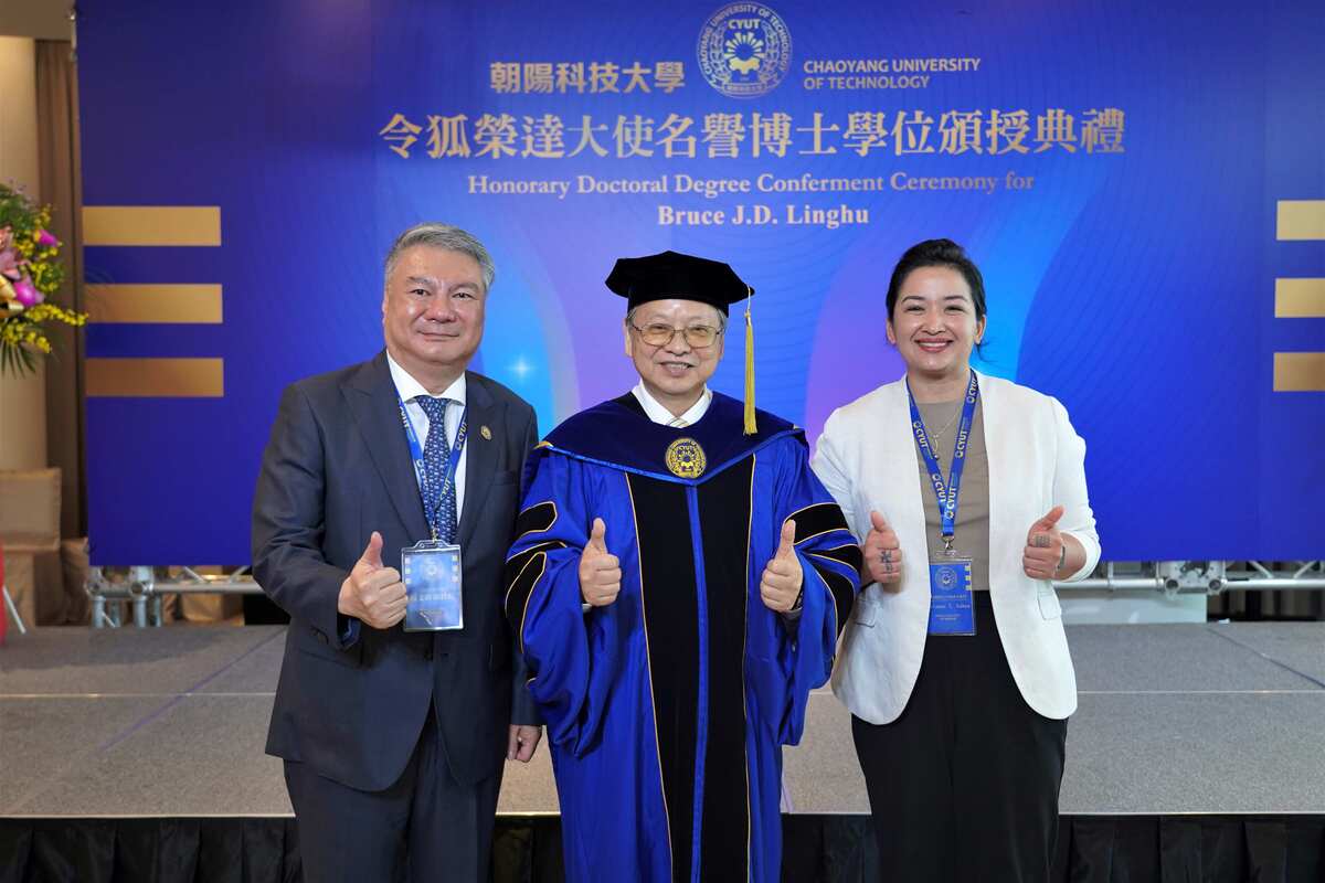 令狐大使表示,朝陽科大已連續6年榮登英國泰晤士全球最佳大學排名,辦學績效與國際聲望備受肯定,十分榮幸能獲頒名譽博士學位,希望未來能與朝陽科大共同推動全球夥伴關係,開創新局。