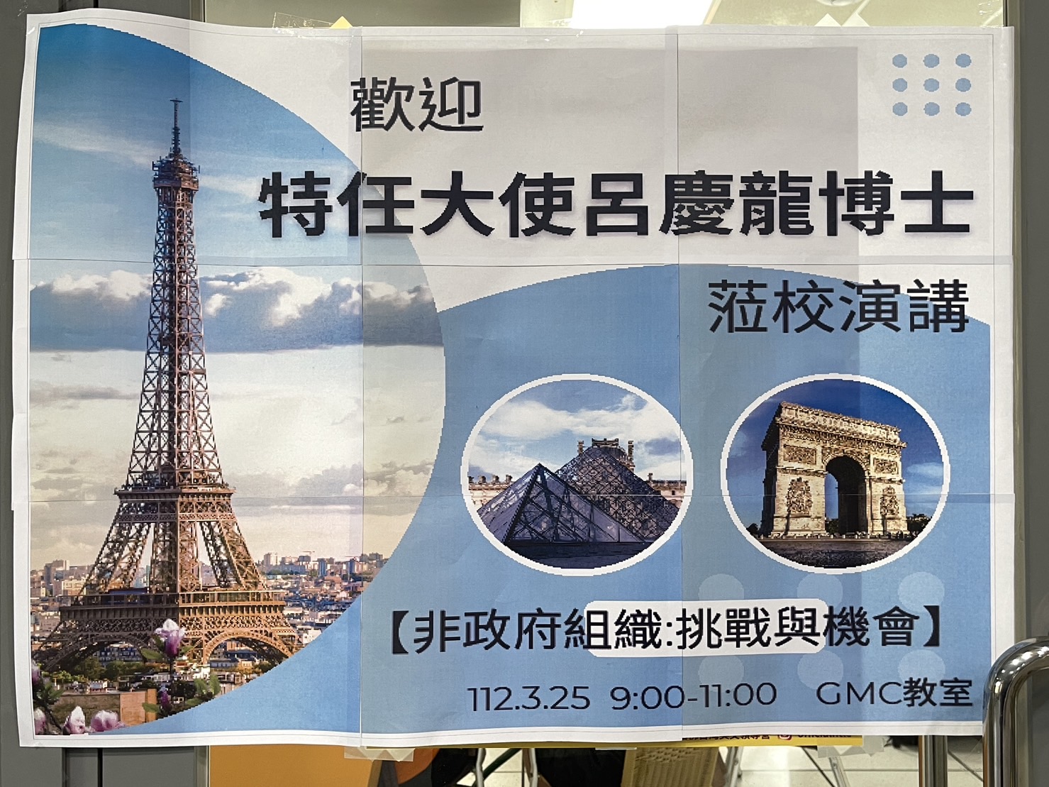 上周六(3月25日)補班補課,對外關係協會(簡稱本會)與臺中市政府教育局在臺中市惠文高中辦理了首場「大使帶你遊世界講座」,邀請擁有42年的外交資歷和16年駐法經驗的呂慶龍大使和學子座談。呂慶龍大使曾在荷蘭、瑞士、海地和日內瓦等地服務,被稱為「最懂得行銷台灣的文化大使」,甚至巴黎有一條被當地市議會命名的「呂慶龍巷」。