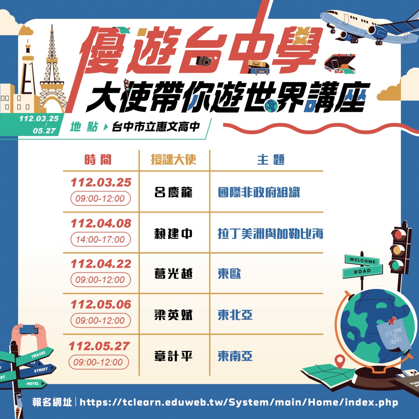 本會與臺中市政府教育局和台中市立惠文高級中學合作,開設「大使帶你遊世界」課程,接著還有4場講座開放中彰投苗高中職學生至優遊臺中學網站報名(http://tclearn.eduweb.tw/System/main/Home/index.php),分別是4月8日賴建中大使談拉丁美洲與加勒比海、4月22日葛光越大使談東歐、5月6日梁英斌大使談東北亞及5月27日章計平大使談東南亞。本會與臺中市政府教育局希望透過各類講座,將各區域的文史地貌及人際經濟交流,鮮明地展現予學生,藉此提升其多元文化與國際理解的核心素養。