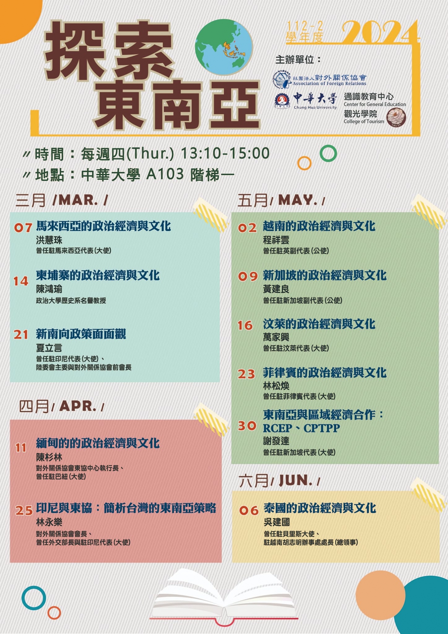 Chung Hua University along side 對外關係協會【Association of Foreign Relations】 have been collaborating to offer an Ambassador General Education Course; currently on it's 12th consecutive semester, the course has spanned for 6 years and counting. With a cumulative total of over a 100 ambassador lectures that haven been held across 5 continents, this initiative has been instrumental in expanding international perspectives and exploring the global arena.