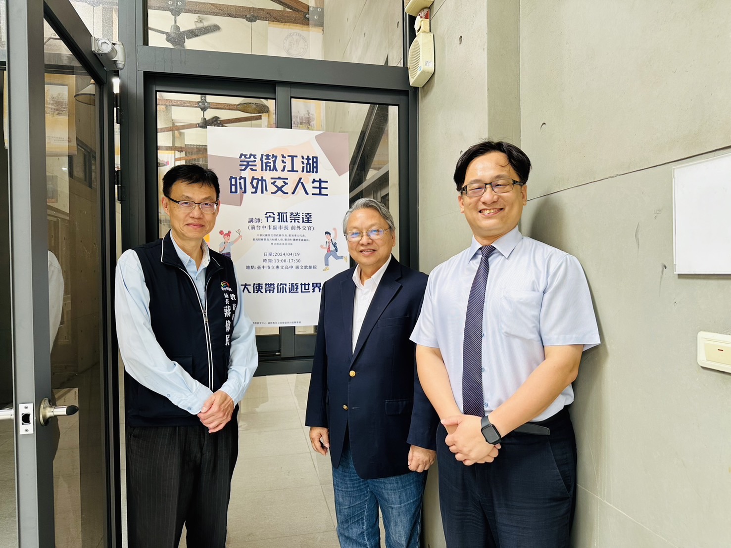 Ambassador Fu Rongda (former representative to Canada Taiwan in Canada former ambassador to the Republic of Marshall Islands 中華民國(臺灣)駐馬紹爾群島共和國大使館 Taiwan in Marshall Islands and former deputy mayor of Taichung City) was invited to participate in the "Ambassador takes you to the world" series of lectures organized by the Education Bureau of Taichung City Government 臺中市政府教育局 on April 19th, he went to Huiwen High School to speak on the topic of "Laughing the diplomatic life of the river and lake" and took the international common sense examination.