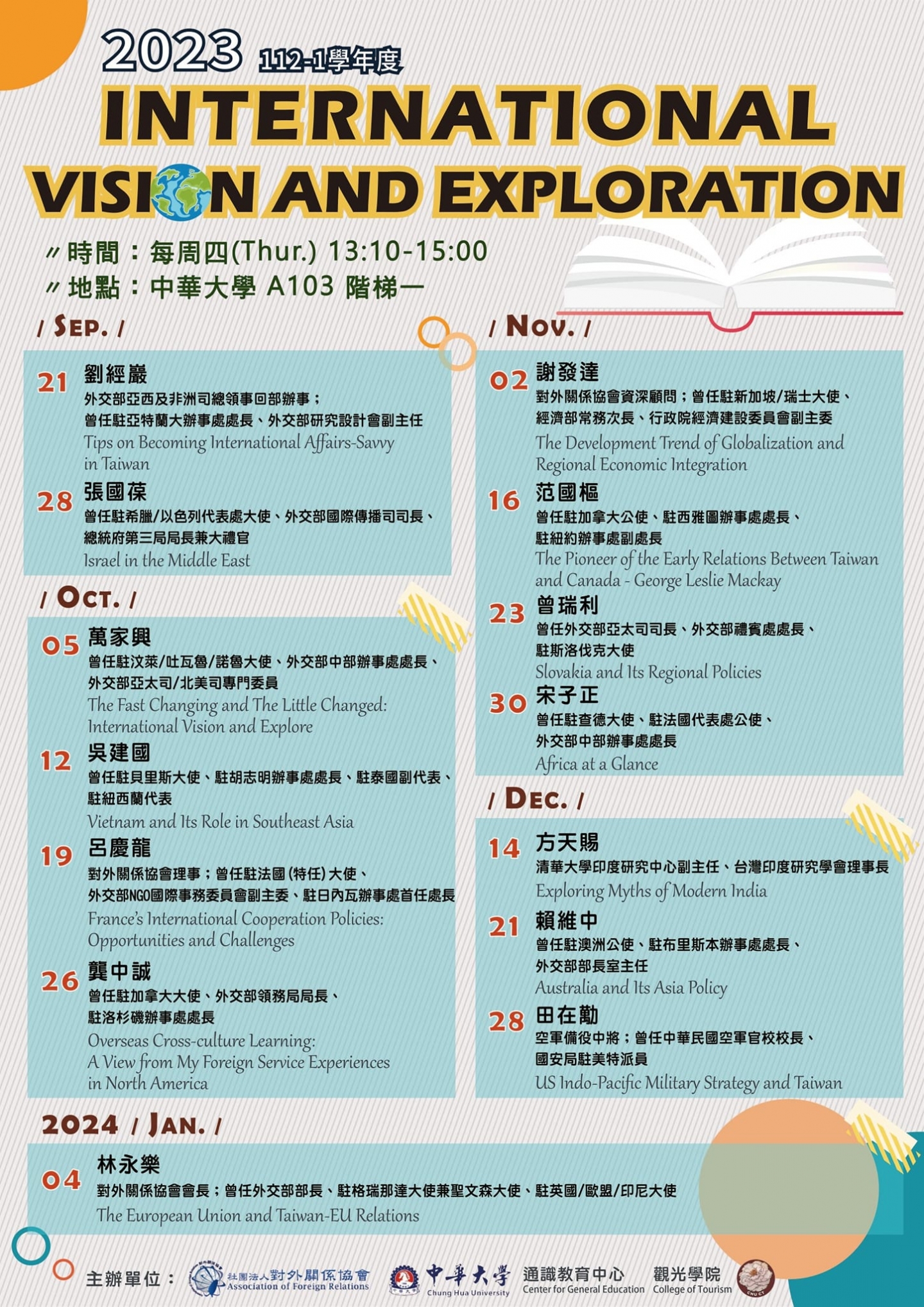 Chung Hua University along side 對外關係協會【Association of Foreign Relations】 have been collaborating to offer an Ambassador General Education Course; currently on it's 11th consecutive semester, the course has spanned for 6 years and counting. With a cumulative total of over a 100 ambassador lectures that haven been held across 5 continents, this initiative has been instrumental in expanding international perspectives and exploring the global arena.