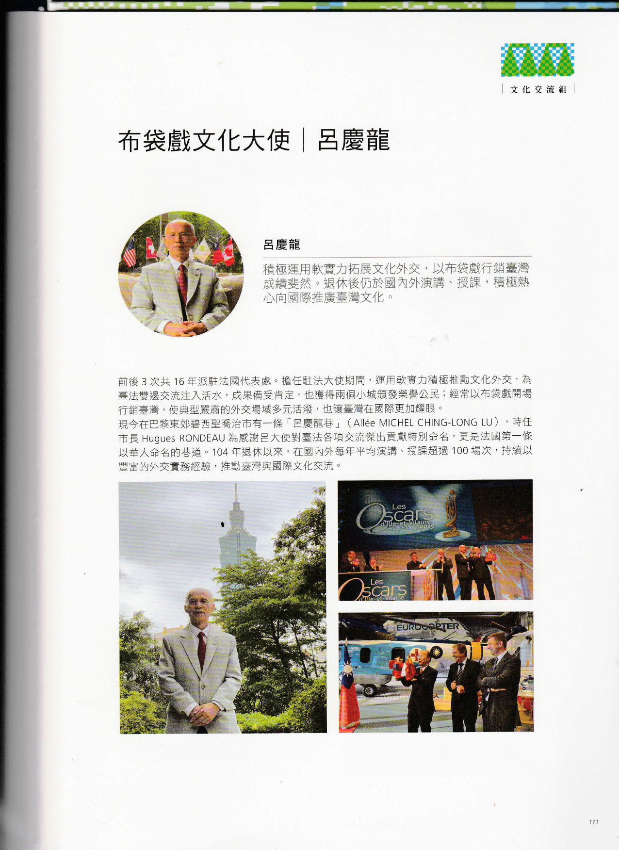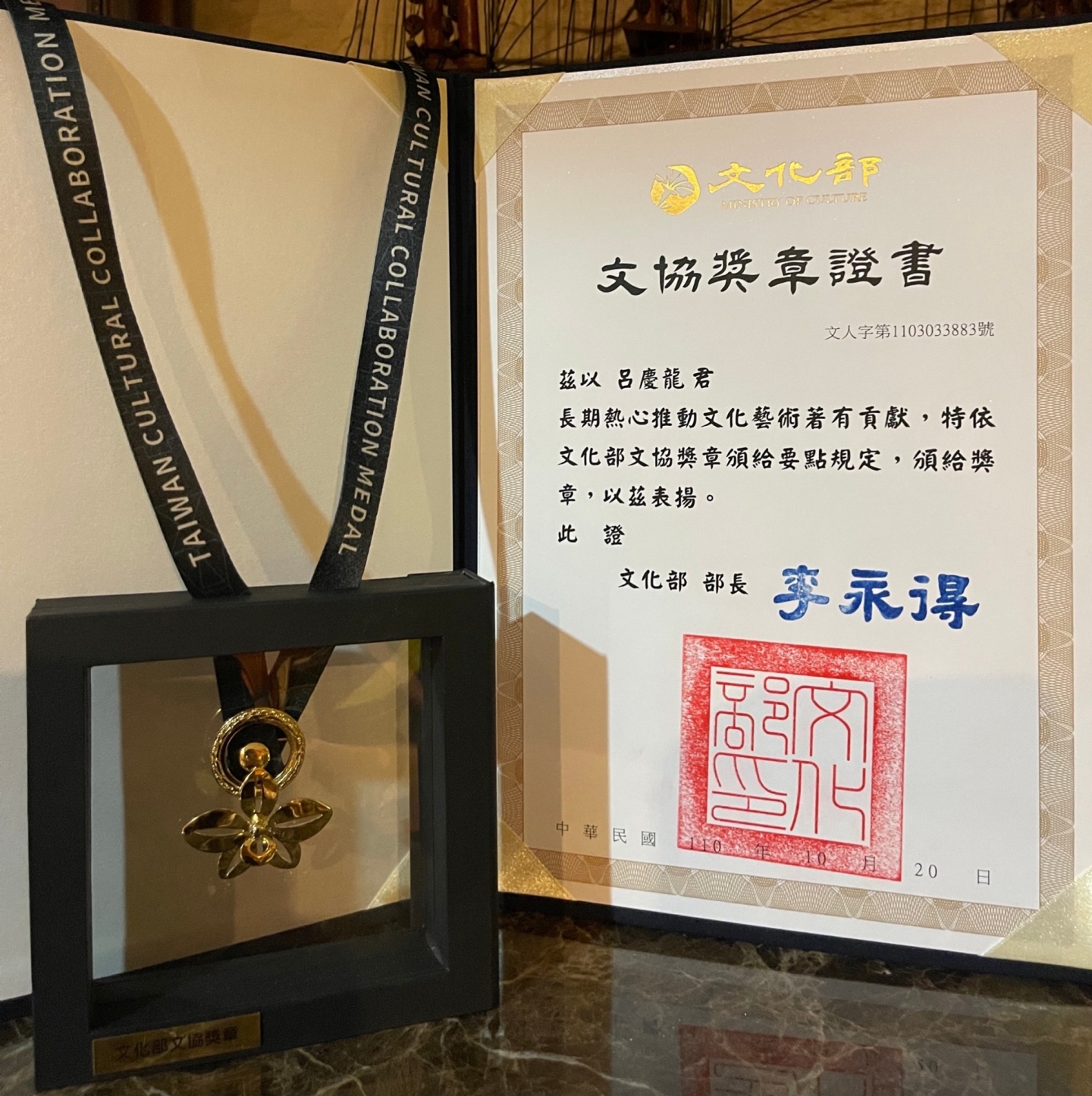 本(110)年11月11日,呂慶龍大使獲得文化部-文化交流組之「文協獎章」。呂大使積極運用軟實力拓展文化外交,並且持續以豐富的外交實務經驗分享傳承,成功向國際推廣台灣文化以及向莘莘學子經驗傳承。