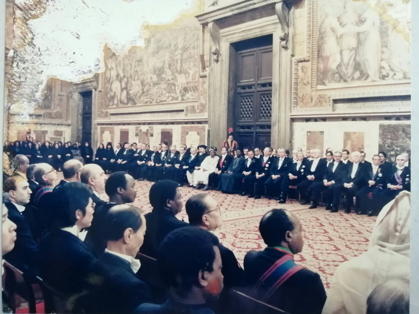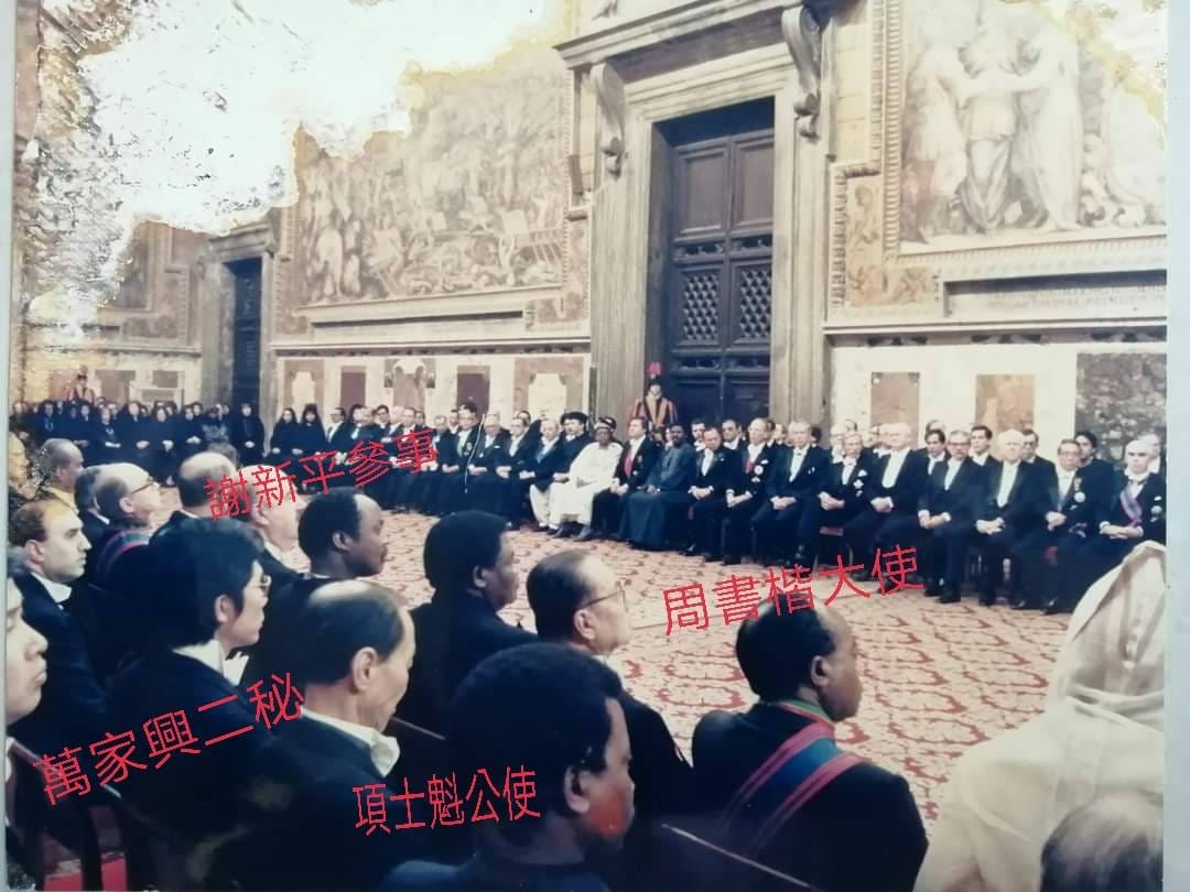 各國大使的服裝多彩多姿。現場絕大多數穿著燕尾服,大使,公使大多配掛綵帶勳章。我國周大使,配戴彩帶勳章,項公使戴著越南總統阮文紹贈與的一枚勳章,謝新平參事和我沒有勳章可配掛。有些歐洲有王室的老牌國家大使例如葡萄牙,丹麥,比利時,愛爾蘭等國大使穿著戎裝,像是十九世紀的將軍,鑲著紅邊的制服,制服上掛著一排勳章,手持像法國騎兵的高帽,腰間配把長劍,雄姿英發。摩洛哥大使為在教宗左手邊第一位,第二資深,一身白衣白袍白帽白披風白鞋。印尼大使一身灰色服裝,頭戴無邊黑色方帽,腰間繫著紅布巾。伊朗大使一身回教打扮,頭上纏白頭巾。巴基斯坦大使穿著像制服的灰色圓領上裝和長褲。置身大廳彷彿回到電影中描述的十八世紀宮廷。菲律賓大使,年輕有為,是李姓華裔後裔,能簡單閩南語交談。新加坡大使,四十歲出頭,非常年輕。我們的亞洲鄰國大使更換很快,朝氣蓬勃。