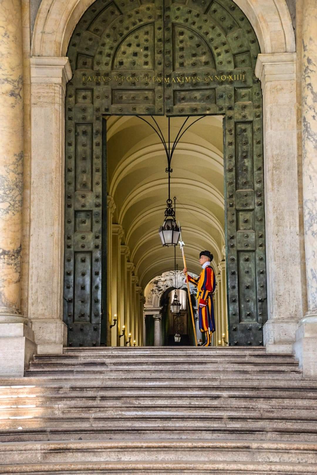 I drove to the entrance of the day's event, Bill Gate, and there was a Mercedes brakes in front of me with the national flag, supposed to be the ambassador of a certain country, the Swiss guard saluted. Our car is silver grey rich, not much eye-catching, but the license plate is CD diplomatic license plate, and the guards salute us. After entering the gate, the road is full of stone blocks that are five hundred years old. Deep palace halls on both sides, spectacularly beautiful. Arrived at the bell tower square of the Apostles' Palace, I parked my car and walked into the Apostles' Palace with my wife in half heels. Guard standing in line with the aisle of the Apostolic Palace, they keep their medieval dress, wearing iron helmets and holding a bench, swords around the waist, uniforms designed by Michelangelo. The captain of the guard gave a message and they saluted our couple.