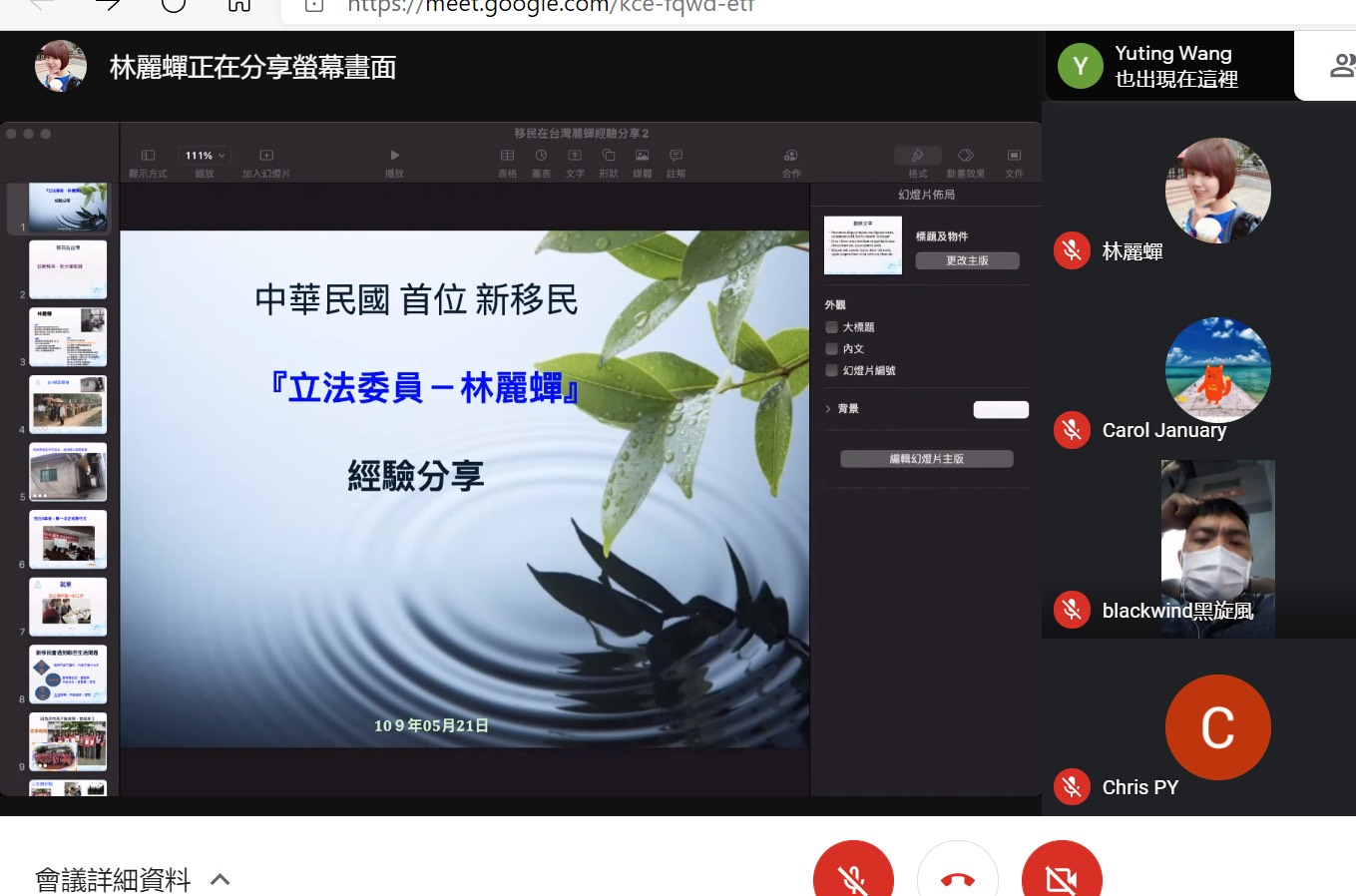 本(110)年5月21日,對外關係協會與政大外交系共同舉辦線上專題演講:「台灣的東南亞新移民」,本次邀請到全國移民團體聯合總會總會長--林麗蟬理事長擔任本次講座主講人,並由對外關係協會黃奎博祕書長擔任主持人。