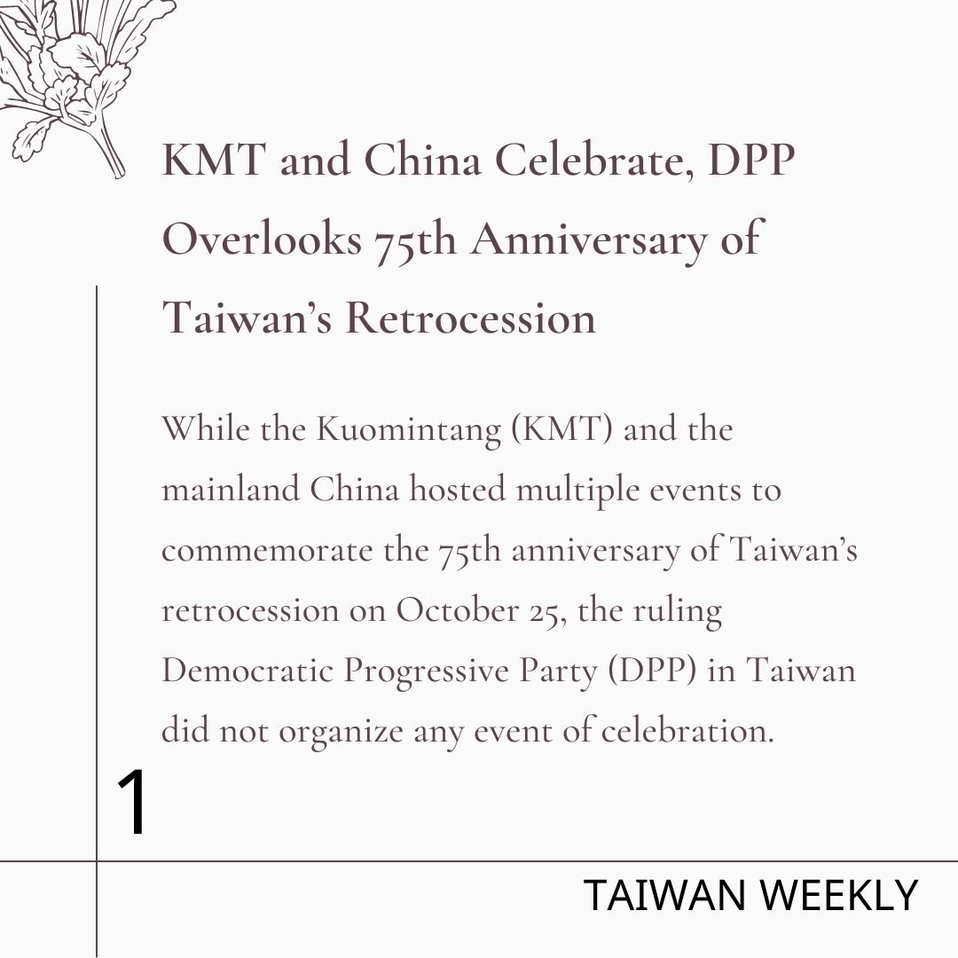 --KMT and China Celebrate, DPP Overlooks 75th Anniversary of Taiwan’s Retrocession