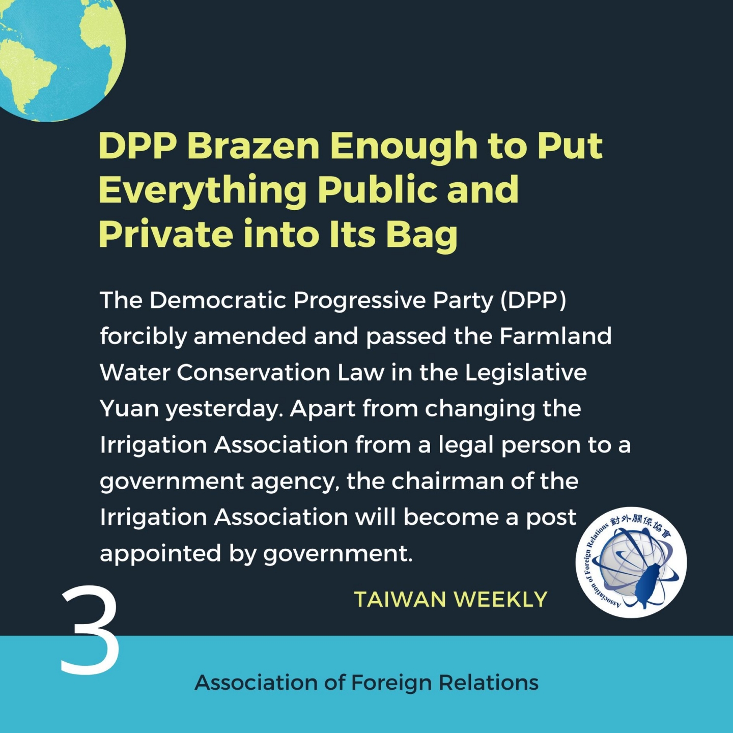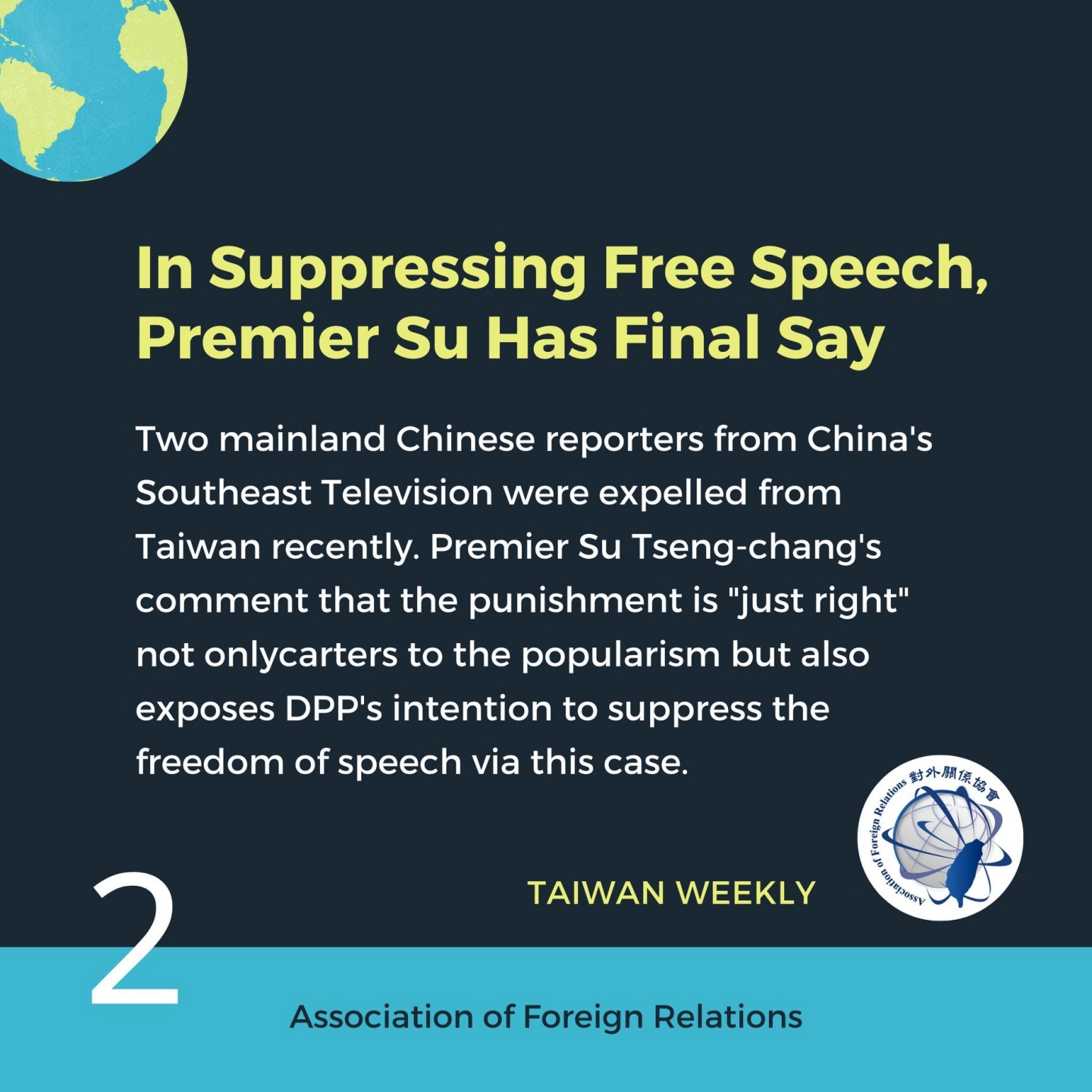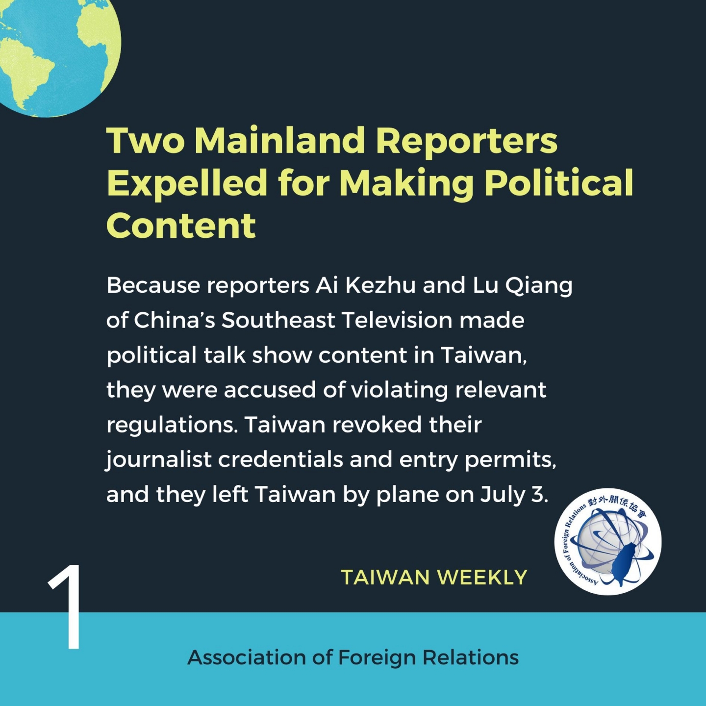 Taiwan Weekly, a reliable gateway to local perspectives and analyses of Taiwan's latest developments circulated in the Chinese-language media, is released every week by Association of Foreign Relations and Fair Winds Foundation.