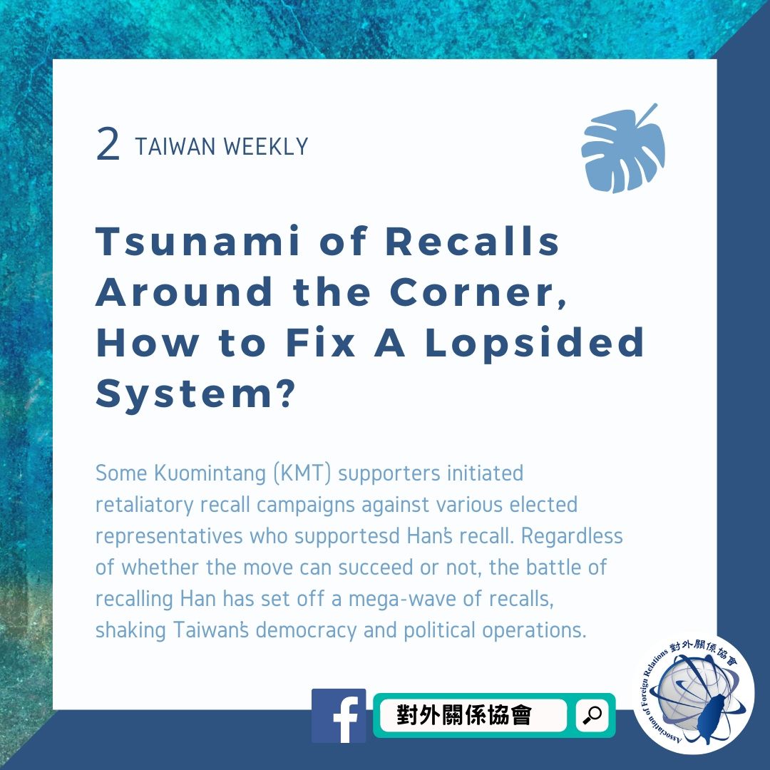 Taiwan Weekly, a reliable gateway to local perspectives and analyses of Taiwan's latest developments circulated in the Chinese-language media, is released every week by Association of Foreign Relations and Fair Winds Foundation.