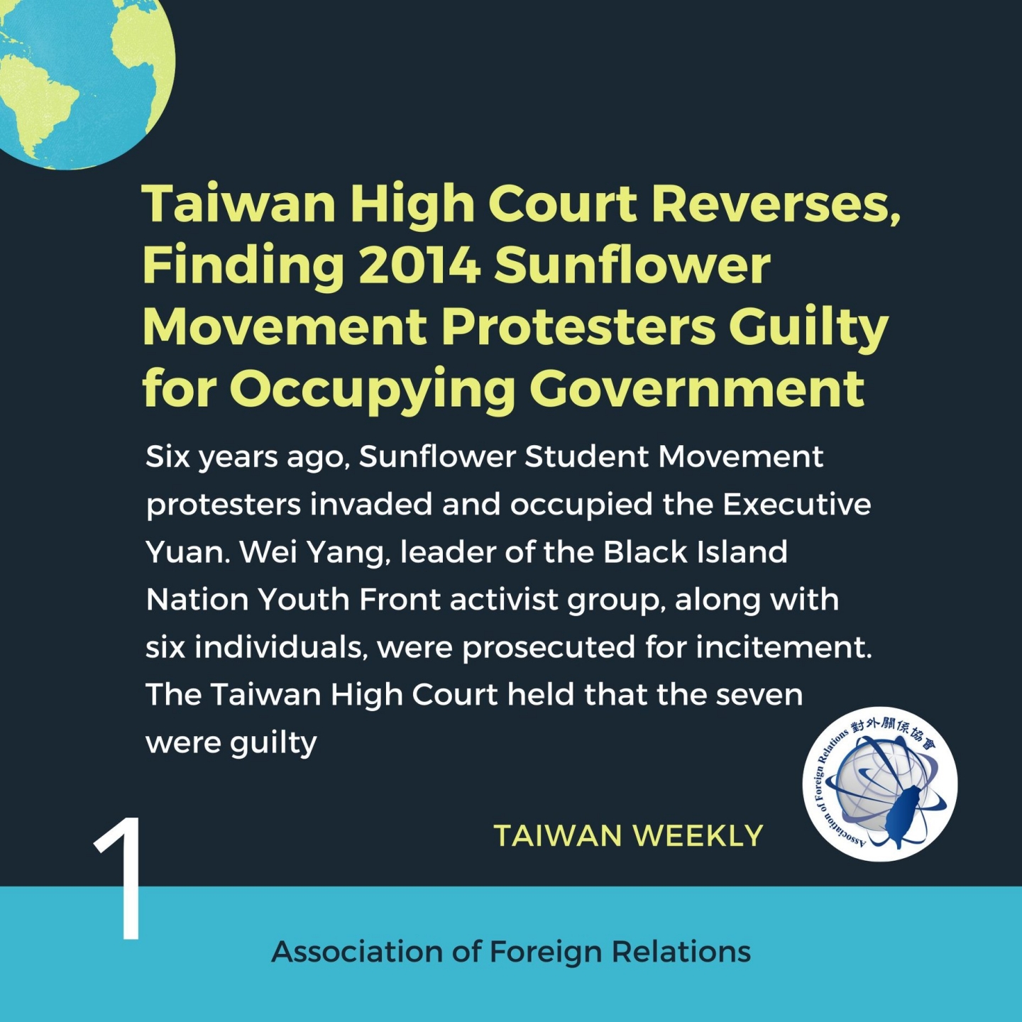 (1) Taiwan High Court Reverses, Finding 2014 Sunflower Movement Protesters Guilty for Occupying Government