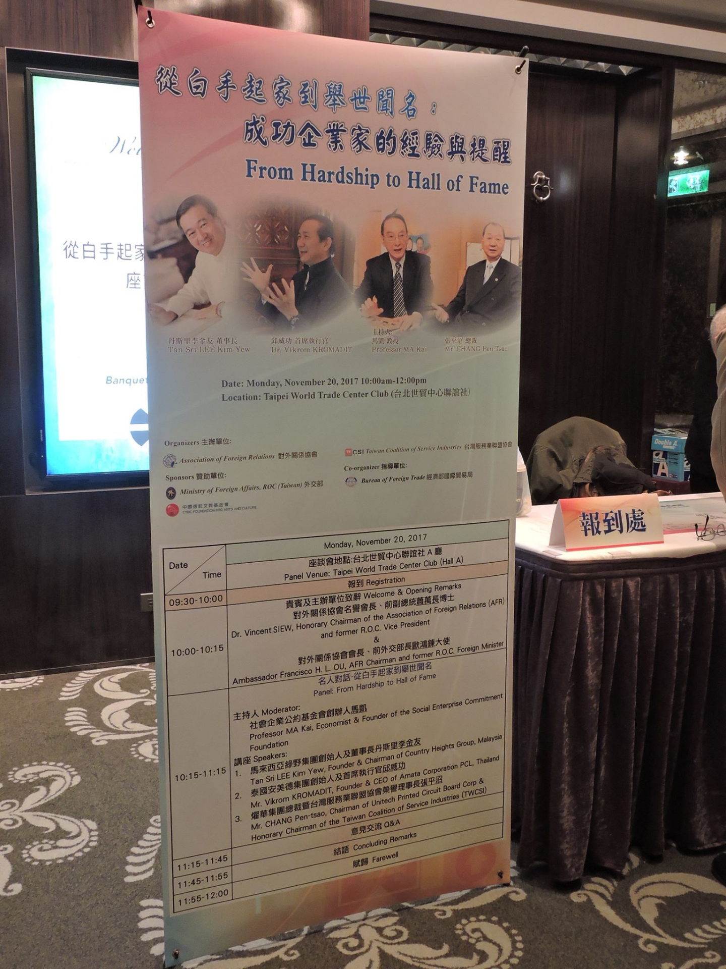 本(106)年11月20日上午10時至中午12時,對外關係協會(以下簡稱本會)與台灣服務業聯盟協會於台北市合辦「名人對話」—從白手起家到舉世聞名: 成功企業家的經驗與提醒,由本會名譽會長蕭萬長及本會會長歐鴻鍊致辭,社會企業公約基金會創辦人馬凱教授主持。三位講座分別為馬來西亞綠野集團創始人及董事長丹斯里(Tan Sri)李金友、泰國安美德集團創始人及首席執行官邱威功、燿華集團總裁暨台灣服務業聯盟協會榮譽理事長張平沼。