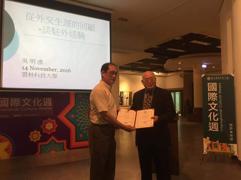 本會與雲林科技大學國際處合辦國際文化週講座,本會監事吳大使明彥於本(105)年11月14日就「從外交生涯的回顧-談駐外經驗」專題演講 🙂