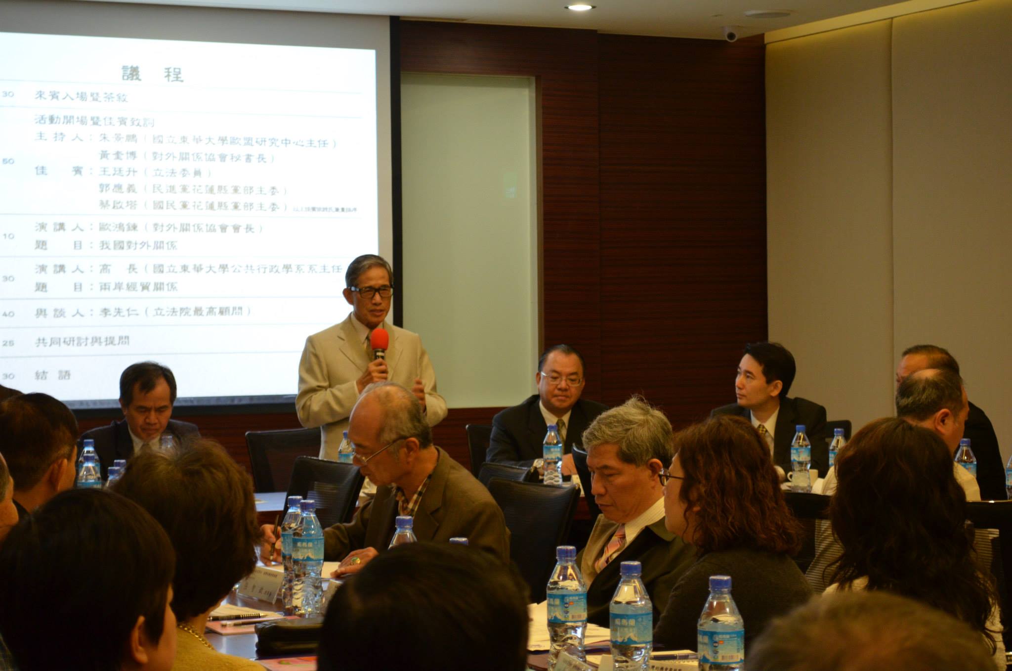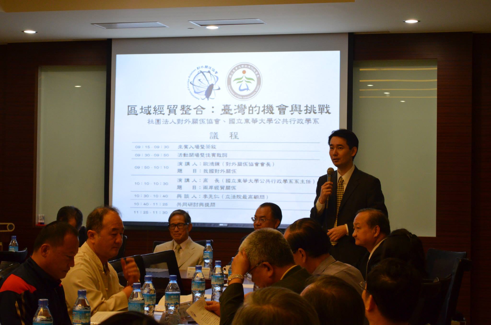 對外關係協會於民國103年3月30日,假花蓮阿思瑪麗景大飯店,與東華大學公共行政學系共同舉辦座談會,邀請花蓮鄉親共同討論台灣經貿外交議題。特別感謝東華大學公共行政學系高長主任、朱景鵬教授協力合辦,也十分感謝民進黨花蓮縣黨部郭應義主委、國民黨花蓮縣黨部蔡啟塔主委以及立法院最高顧問李先仁總裁出席致詞或與談。(王廷升立委因公務無法抽身而請陳主任代為出席、縣議會楊文值議長不克出席、外交部東部辦事處陳進賢大使因故臨時由曹秘書代為出席。)
