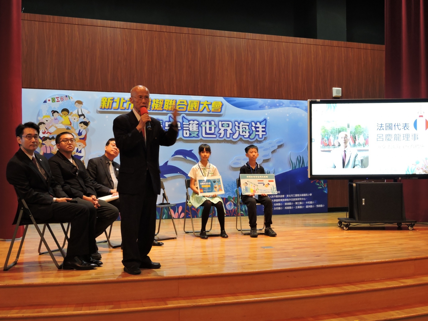 「新北市112學年度國小模擬聯合國大會──永續守護世界海洋記者會」中,學生化身為小外交官,扮演193位模擬聯合國會員國代表,與新北市劉和然副市長、會長林永樂大使以及臺灣鯨豚保育紀錄片《鯨之聲》導演張弘榤等人分享海洋保育經驗。學生們結合AI技術提出創意豐富的海洋保育方案,並在網站上發布連署,呼籲全球守護海洋。
