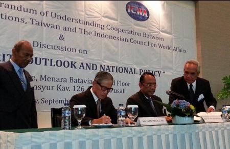Ambassador Francisco H. L. Ou and Professor Kwei-Bo Huang, chairperson and secretary-general of the Association of Foreign Relations, visited Indonesia between September 27 and September 30, 2015 to sign a memorandum of understanding on cooperation with the Indonesian Council on World Affairs, represented by Ambassador Makarim Wibisono, for the purpose of advancing the cooperation, exchanges and engagement between the two organizations.