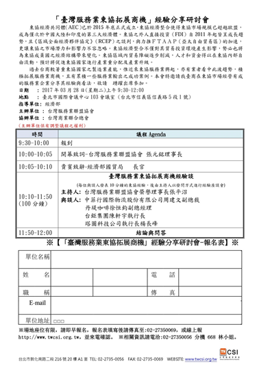 Taiwan Coalition of Service Industries will hold “Experience-sharing seminar on Taiwan’s service businesses in Southeast Asia”on March 28th, 2017 at Conference room 103 of Taipei International Convention Center.