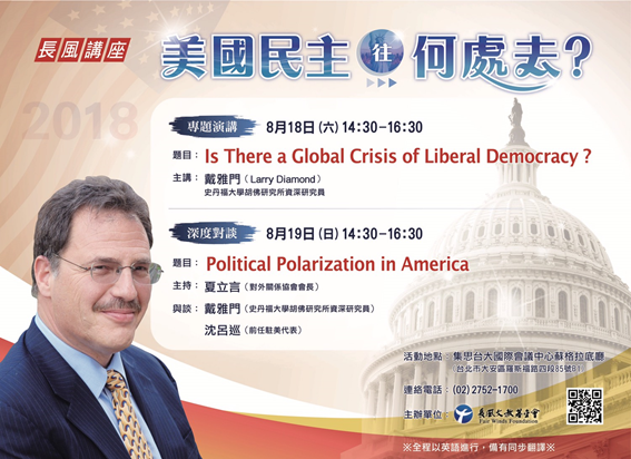 【長風講座】美國民主往何處去?兩百多年來,美國始終是引領全世界民主發展的標竿。但是近幾年來,美國民主似乎陷入日益窘迫的困境,使全球民主發展的前景也蒙上了令人不安的陰影。資本主義的侵蝕、貧富懸殊的加劇、社會價值的極端對立、民粹主義的推波助瀾,都讓人們對民主政治越來越感不滿。究竟自由主義式民主出了什麼問題?可不可能克服它所面臨的困境?讓我們與研究全球民主的頂尖學者Larry Diamond教授一起深入探索。講座、主持人、與談人戴雅門(Larry Diamond)- 史丹福大學胡佛研究所和Freeman Spogli國際研究中心(FSI)的資深研究員,為世界知名的民主研究學者,其專長領域為比較民主發展和美國外交政策。他曾擔任「民主、發展和法治中心」主任,並主持關於阿拉伯改革與民主,以及臺灣民主的研究計劃。他是《民主雜誌》(Journal of Democracy)的共同創刊編輯,也是美國國家民主基金的高級顧問。夏立言- 國立政治大學外交學系碩士、英國牛津大學法律學系碩士,曾任行政院大陸委員會主任委員、國防部軍政副部長、外交部政務次長、駐印尼代表、駐印度代表、駐紐約辦事處處長等重要職務。沈呂巡 - 美國賓夕法尼亞大學國際關係博士,曾任駐美國代表、駐英國代表、外交部政務次長、駐歐盟兼駐比利時代表處代表、駐日內瓦辦事處處長、駐美國代表處國會聯絡組組長及秘書(政治)組組長等重要職務。
