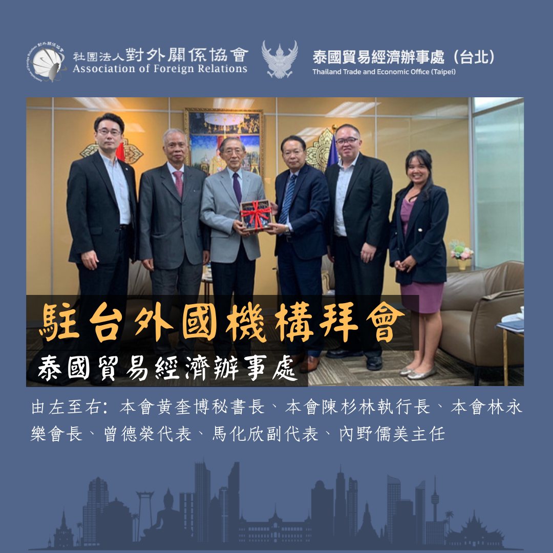 本會林永樂會長、東協中心執行長陳杉林大使與黃奎博秘書長於2023年8月拜會泰國貿易經濟辦事處曾德榮代表(Executive Director Twekiat Janprajak)、馬化欣副代表(Deputy Executive Director Sunh Arunrugstichai)、內野儒美主任(Chief of Economic Affairs Section Dheerangkun Uchino)、洪萊雅主任(Chief of Political Affairs Section Araya Na manorom),介紹本會會務及構思未來合作計劃。