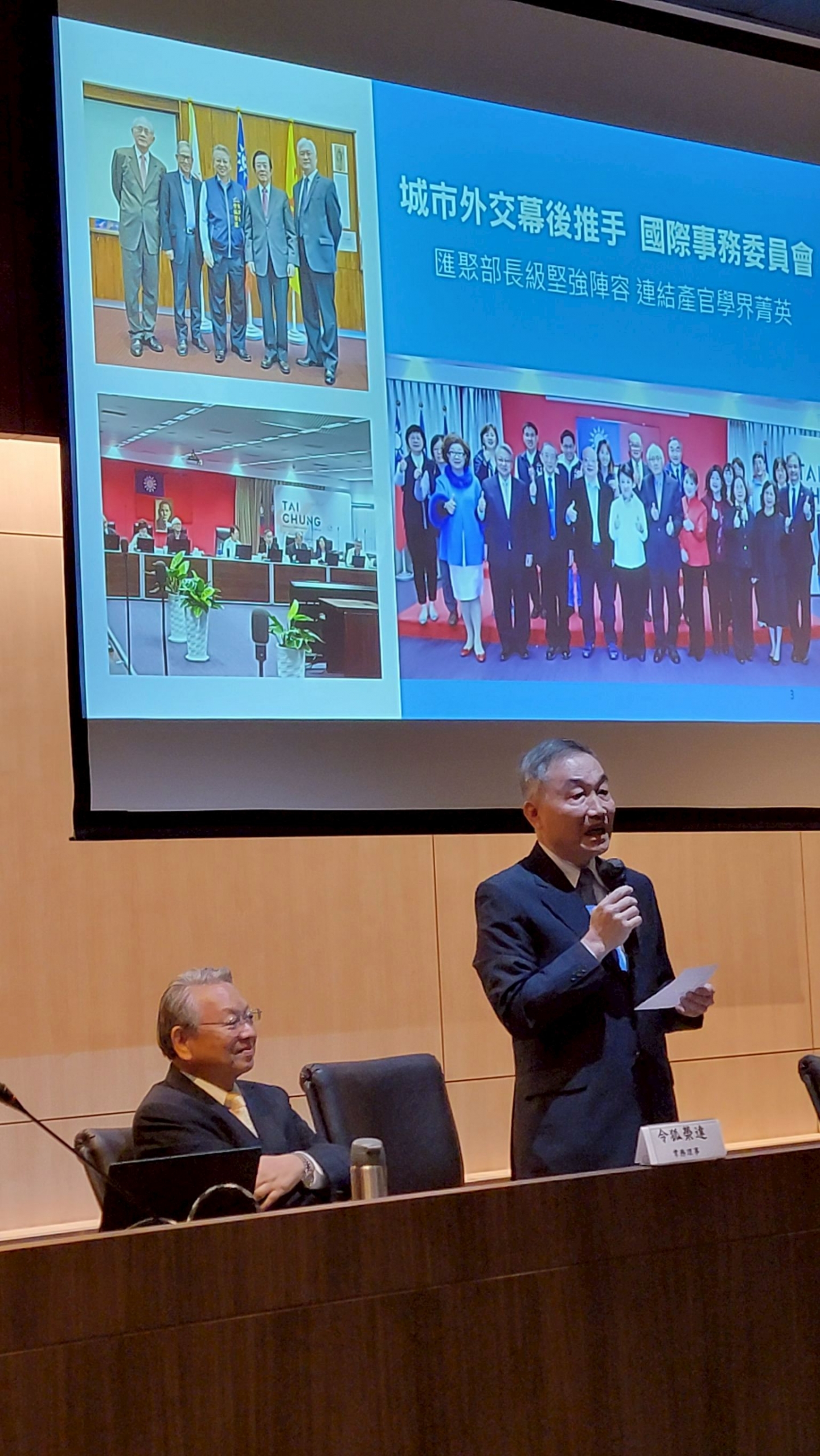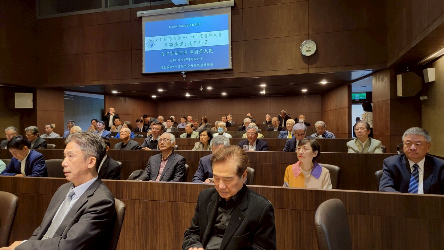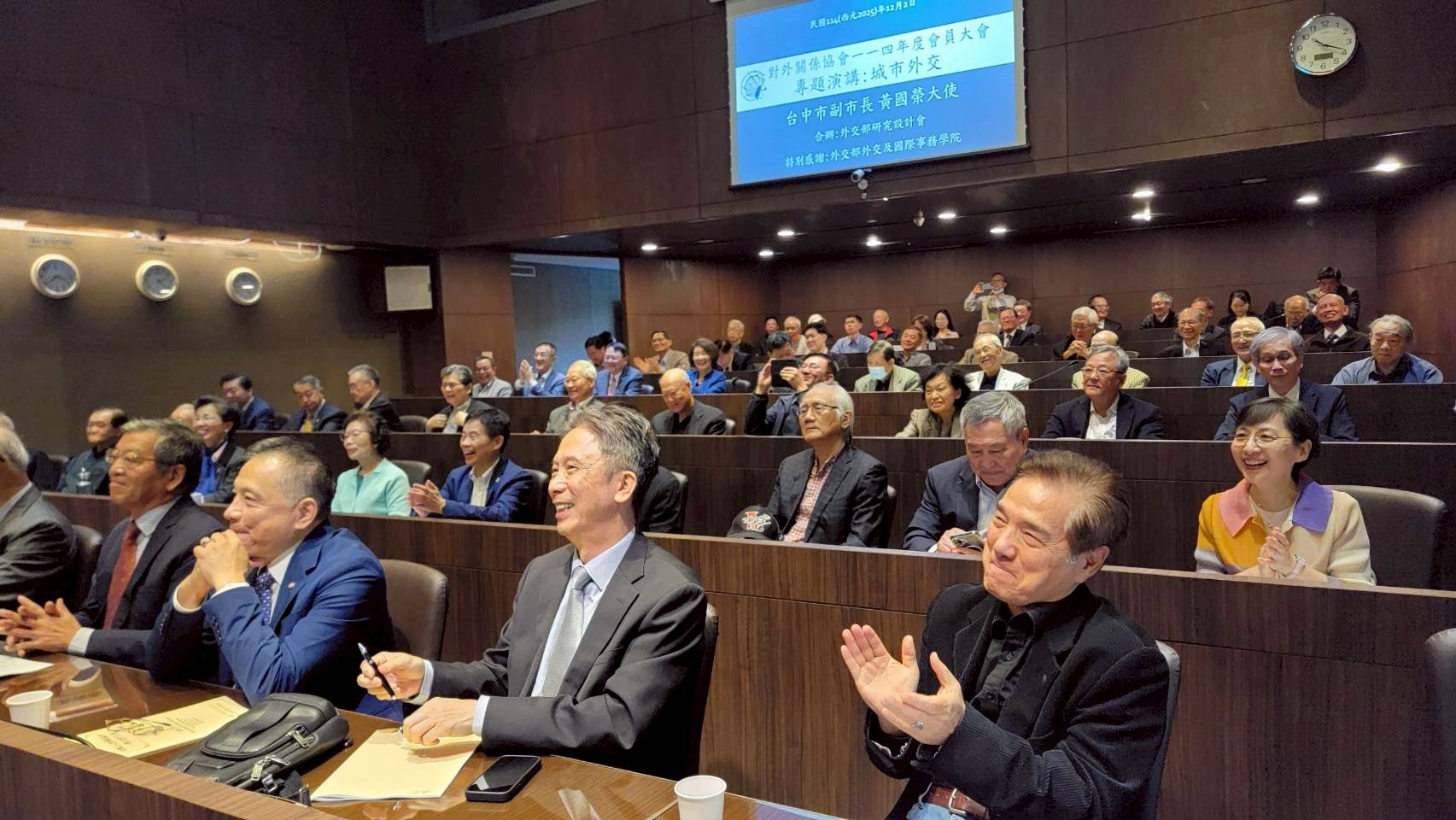 協會另邀請台中市副市長黃國榮大使進行「城市外交」的專題演講,吸引會眾高度關注。黃副市長曾派駐蒙古國等地,涉外經驗豐富,他還特別提到對外關係協會與台中市政府合作的「大使帶你遊世界」演講活動,目前已經超過兩萬學子受惠。