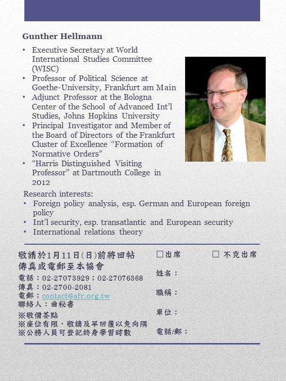 WISC/法蘭克福大學Gunther Hellmann教授演講會:「歐盟外交政策與東歐及中東危機之弧」