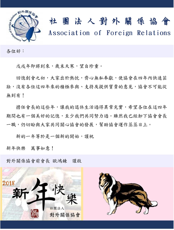 本會創會會長歐鴻鍊部長的新年祝福